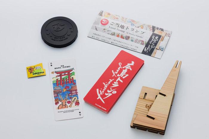 「ゴトカン ご当地トランプシリーズ」は、書道家でありイラストレーターでもある千秋育子氏によるアート作品です。各都道府県ごとに54枚すべて異なる図柄が描かれており、トランプを通して旅の思い出を振り返り、次に訪れたい場所を見つけることができる、まるでガイドブックのような仕上がりになっています。また、インバウンドを意識したデザインに加え、オリジナル家紋の焼印が入った専用のカードスタンドも同梱しており、飾って楽しむこともできる作品です。