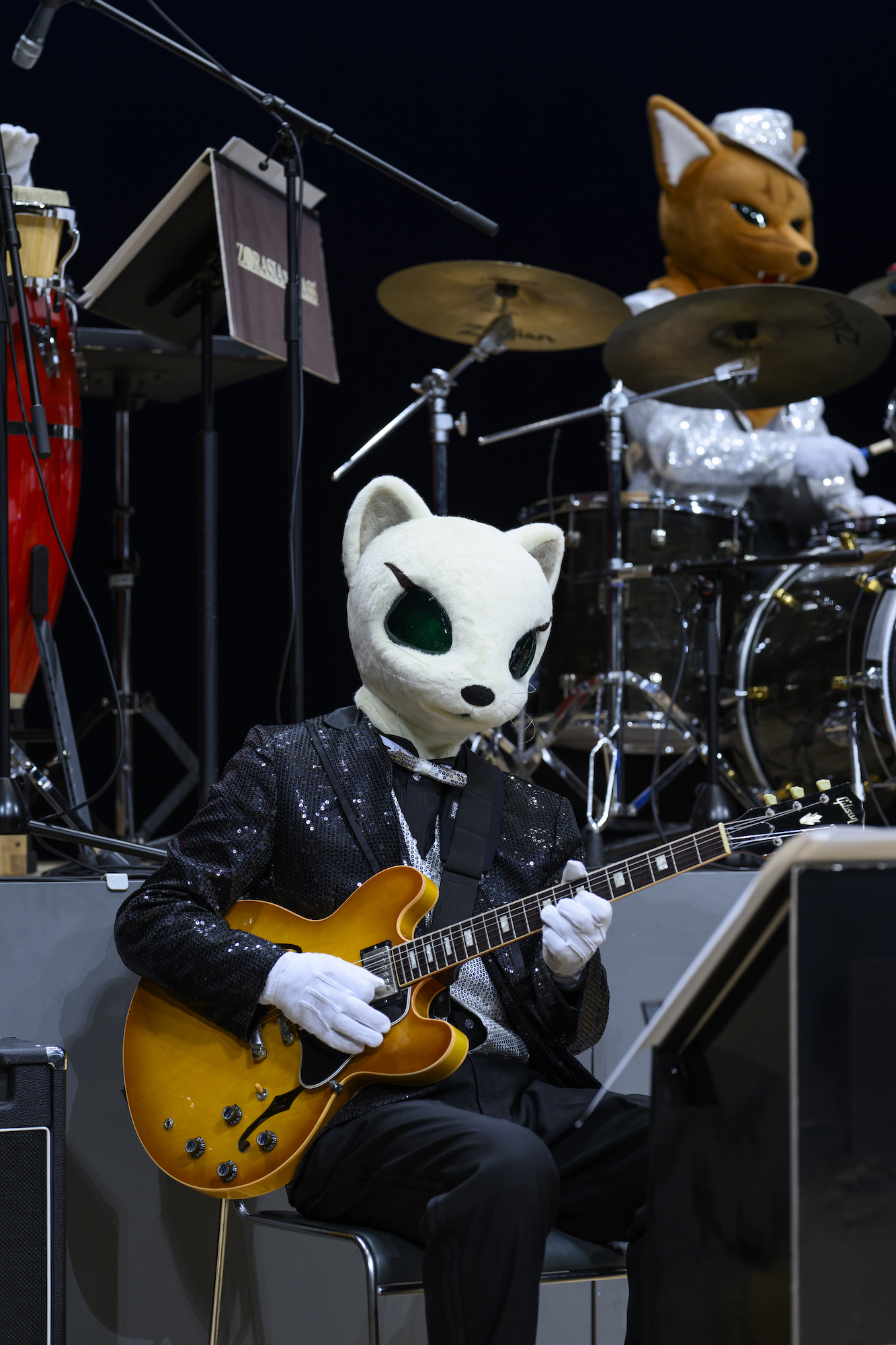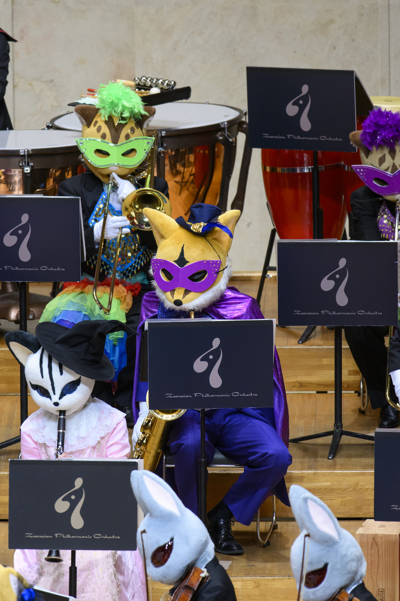 ズーラシアンフィルハーモニー管弦楽団に加えて、サックス四重奏のサキソフォックスとギターのオコジョも出演。オーケストラが更にノリノリでご機嫌なサウンドにパワーアップします。