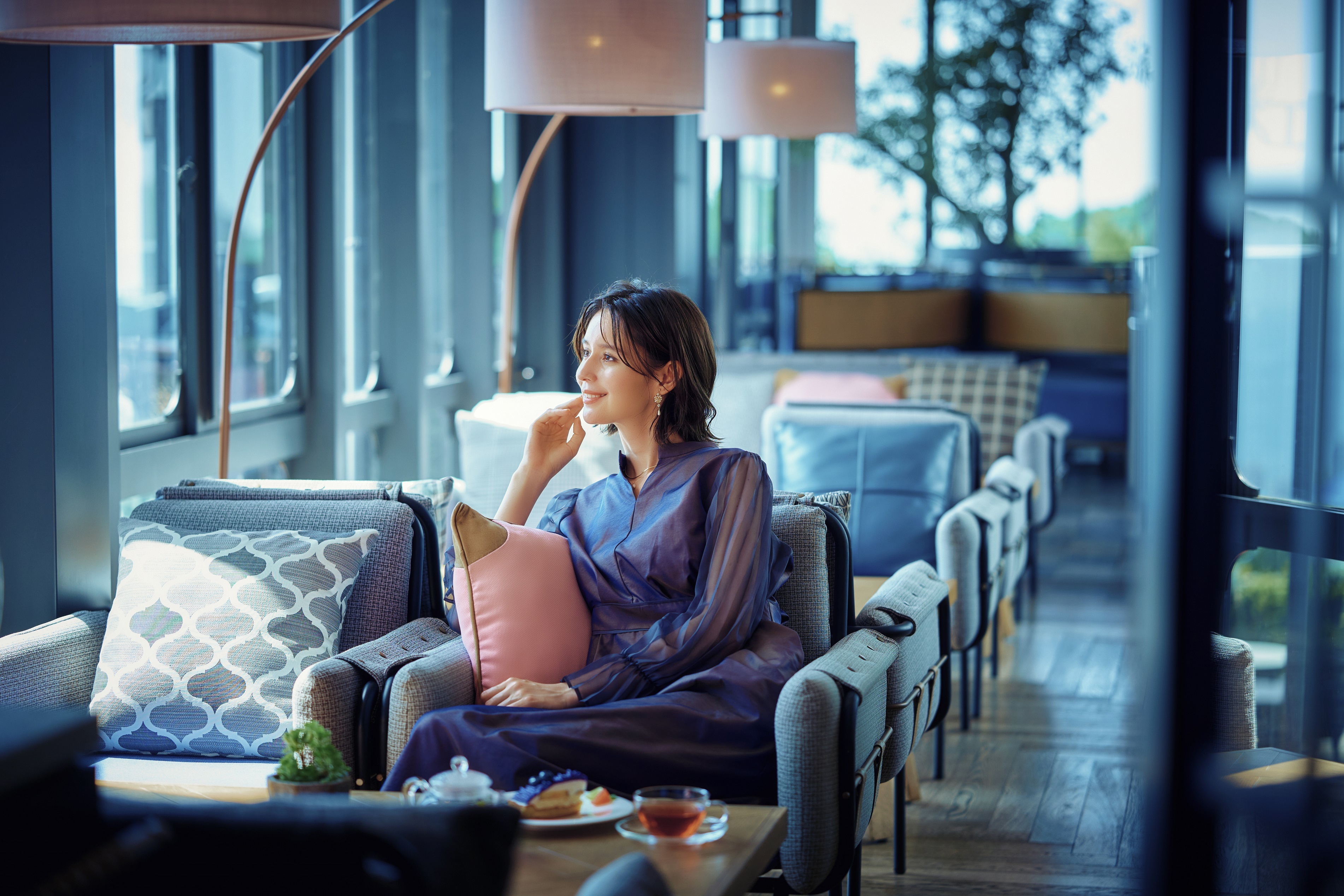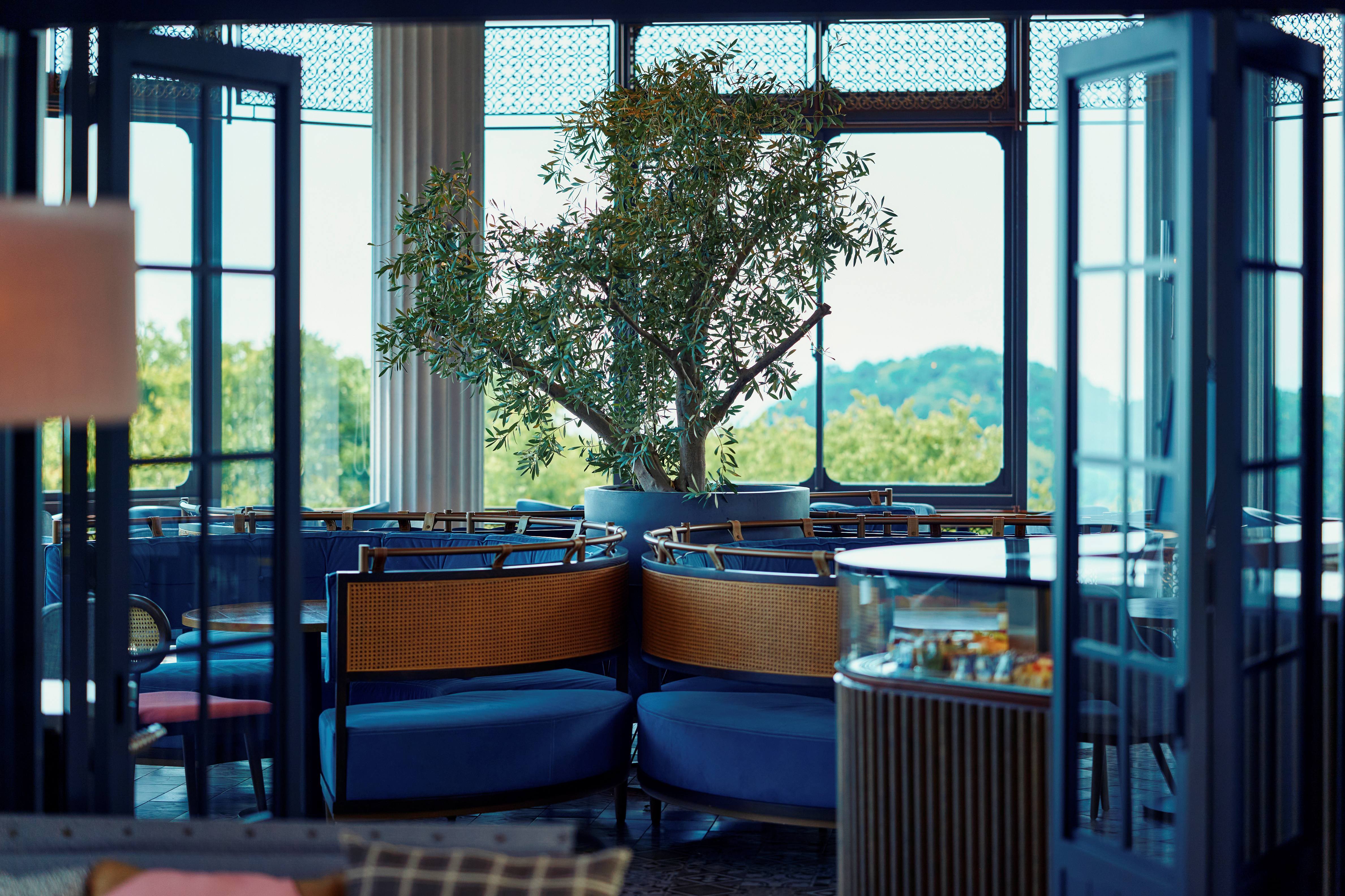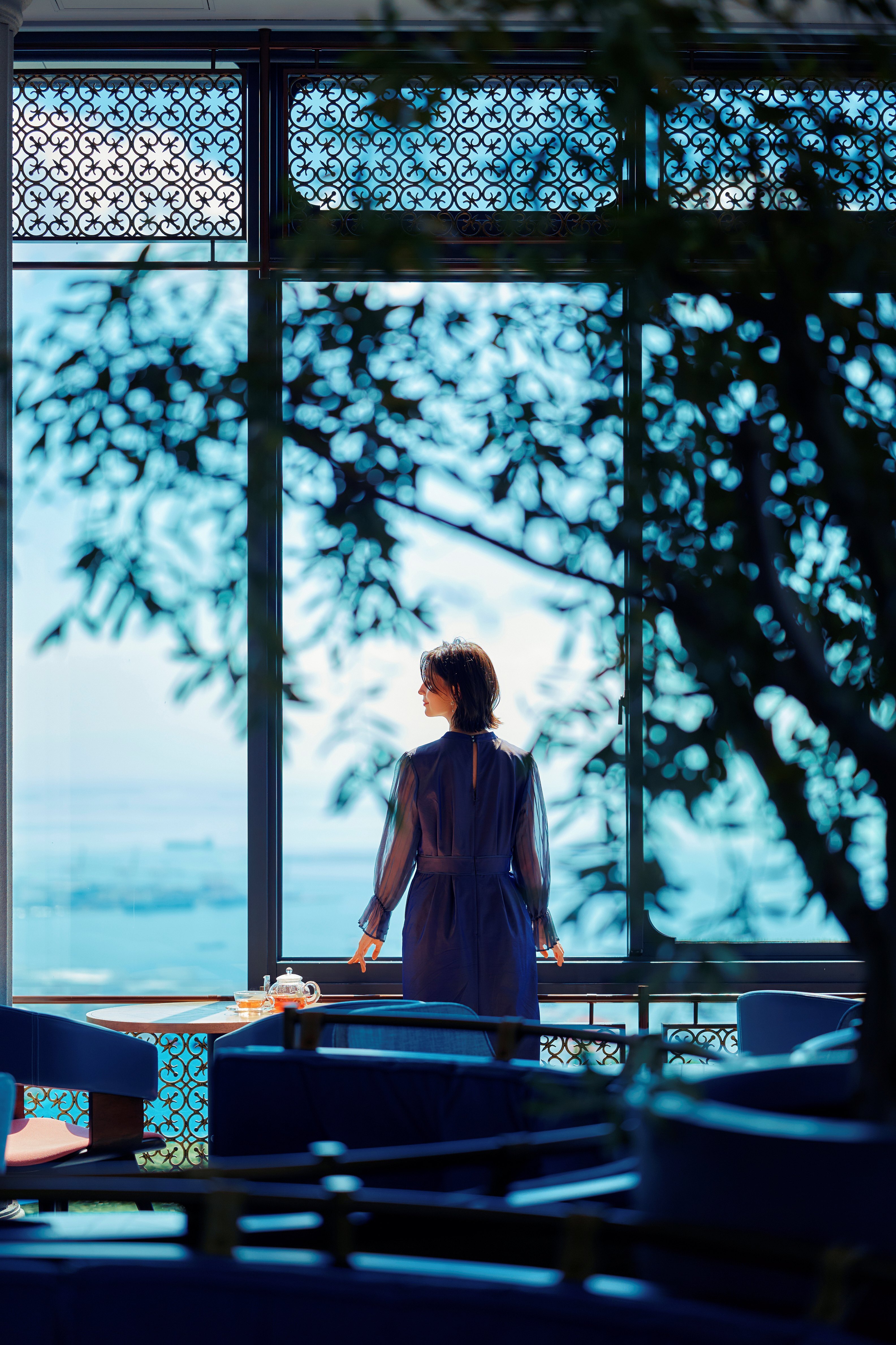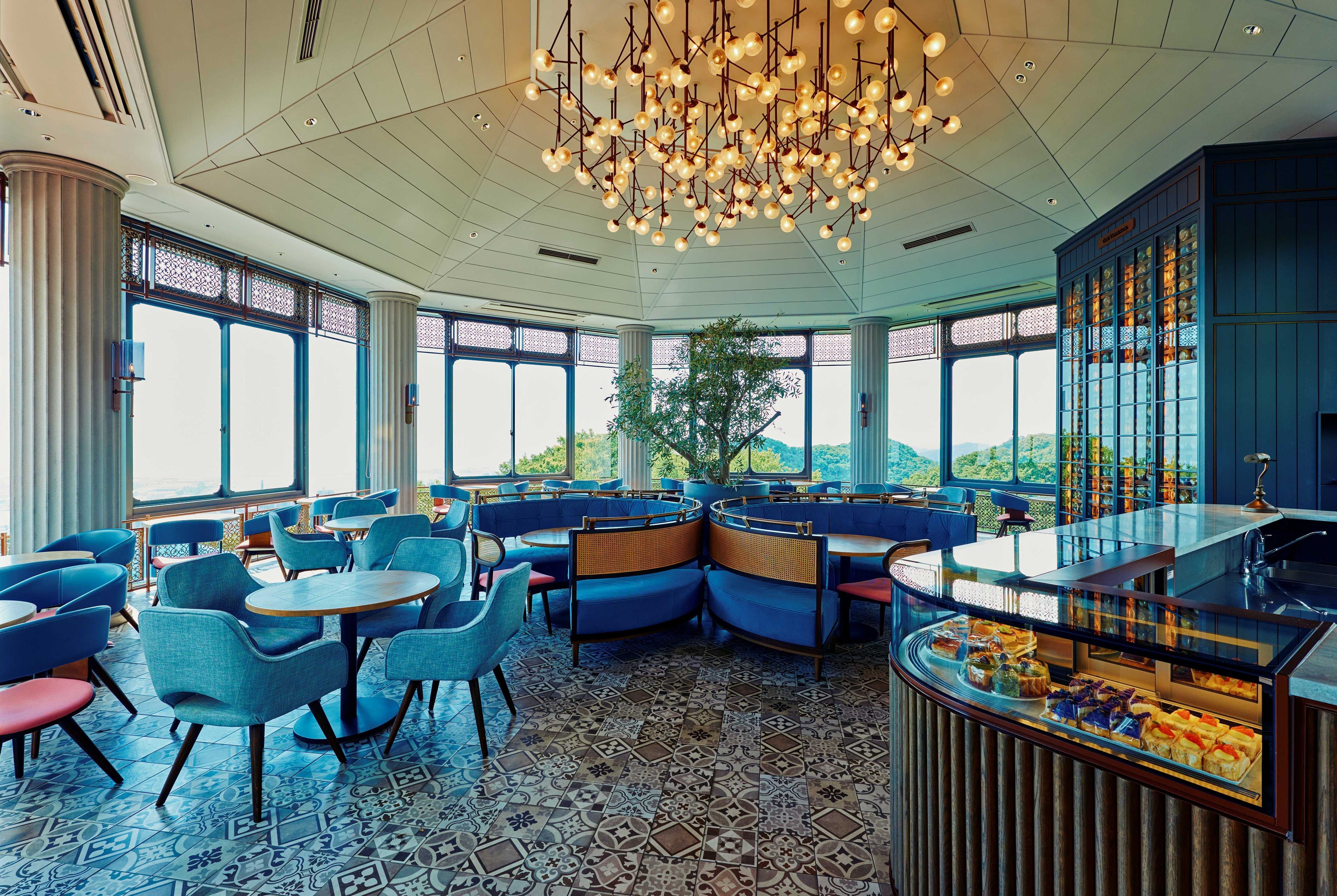 暖かな陽光が差し込む大きな窓から煌く海と豊かな緑が望めるラグジュアリーなカフェ。