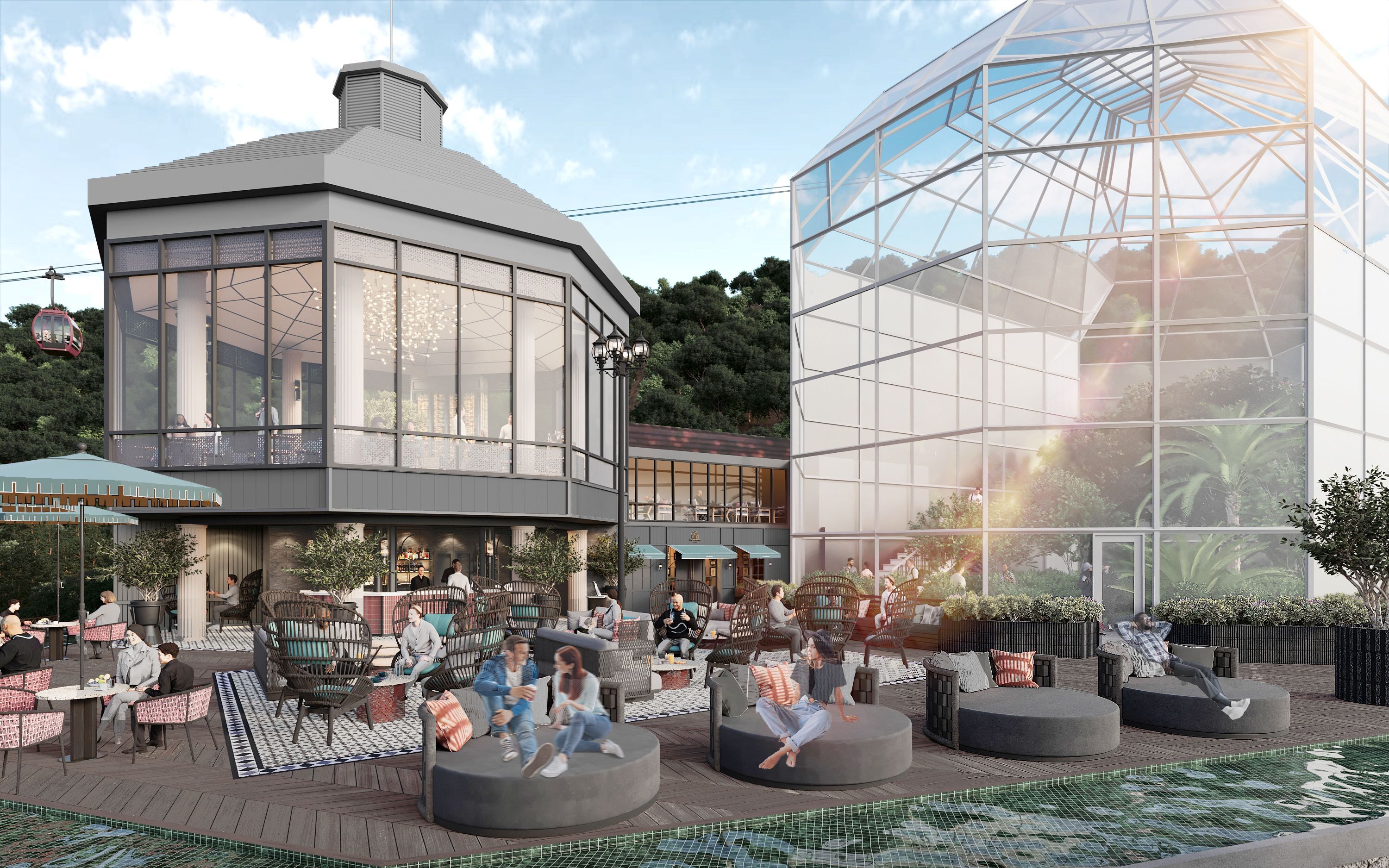 (2)既存テラスを「ガーデンテラス」として改修・拡張し、さらには、正八角形の3つの新スポット「エメラルド ラウンジ」「スカイバー」「ハンモック サンクチュアリ」が有機的に森の中に浮かぶように配置されています。