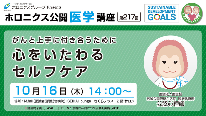 医療法人医誠会(大阪府大阪市 代表者:谷 幸治)では、第217回ホロニクス公開医学講座 『がんと上手に付き合うために 心をいたわるセルフケア』を大阪市北区南扇町にあるi-Mall内ヘルシーカフェ「ISEIKAI lounge さくらテラス 2階サロン」にて2025年10月16日(木)に開催いたします。