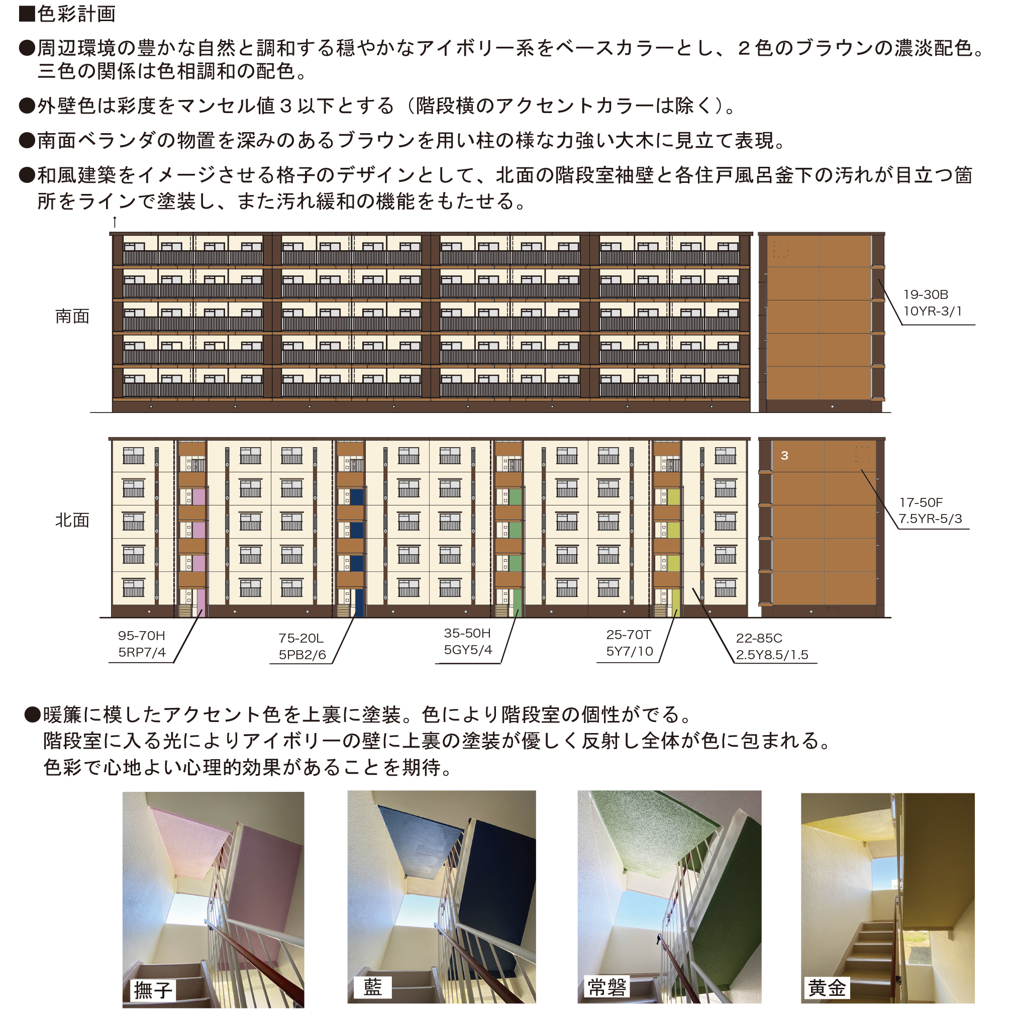 湯河原の歴史は古く万葉集に詠われています。古来から湯治場として栄えた歴史を色彩に反映させるため、物件を温泉旅館に見立てて色彩設計を行いました。ポイントは、湯河原という風光明媚で自然豊かな地区の周辺環境と調和した色彩構成。住民がコミュニティを感じ、親近感とわかりやすさを大切にした印象づくり、経年変化(汚れ)を考慮し配色に落とし込みました。今回、「寄木をテーマにした物件で、杢を思わせるYR系による融和感と縦ラインを強調した明暗のコントラストの表情が、安らぎ感と新鮮さを両立させている。」と評価され、グッド・ペインティング・カラー改修部門の最優秀賞を受賞しました。