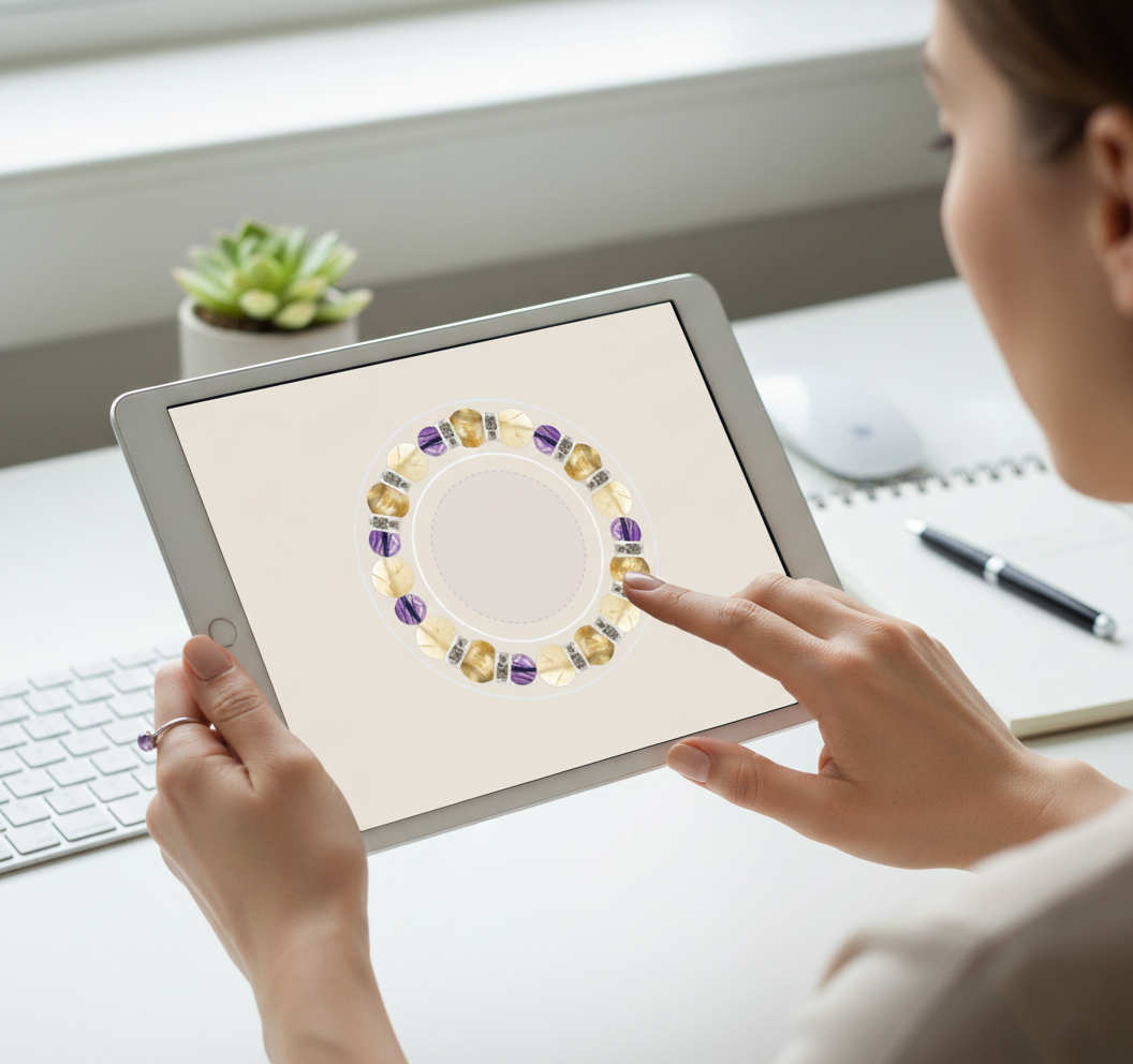 最大の特徴は、AIを活用したオリジナルブレスレット設計機能「Bracelet Maker」の導入です。予算、手首サイズ、テーマ(恋愛・仕事・浄化・守護など)を入力すると、AIが最適な天然石の組み合わせを提案。さらに手動で石の変更・配置調整も可能なため、セッション中の提案ツールや、店舗オリジナル商品の設計に活用できます。