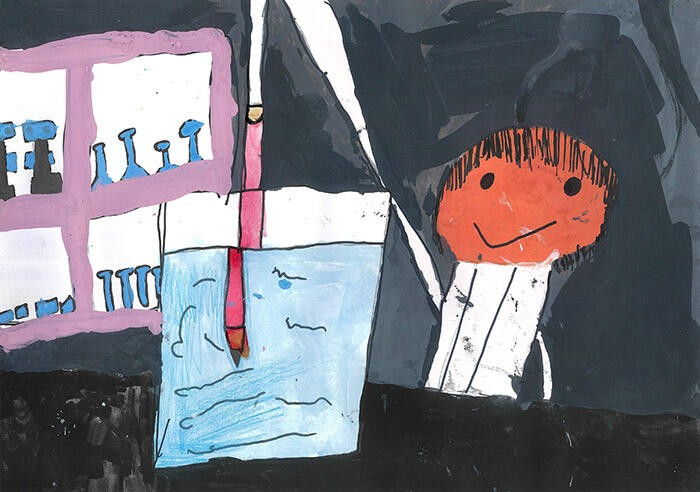 私は実験が大好きです。小学校の理科室で、水に入れた鉛筆が折れて見える様子を描きました。