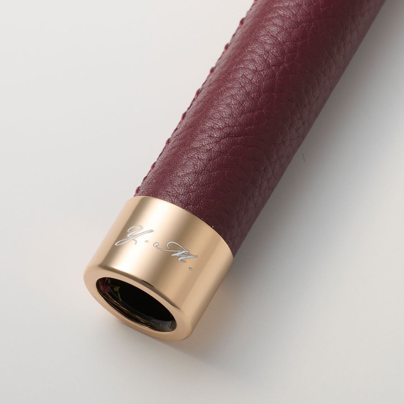 レザーは世界的にも評価の高いパキスタン原産で、厳しい国際基準をクリアした工場で加工されています。染ムラが出ないようにしっかりと染められた革は滑らかな質感が特徴です。手元の土台に革を巻き、手縫いで一針ひとはり丁寧に縫製します。特に手元は一般的な革製品に比べ特殊な形状により加工が難しいのが難点です。曲がりの内側部分では、シワを寄せながら中に巻き込むように縫い続ける点で非常に高度な技術が必要となります。熟練の革職人が縫製した無駄のない縫い目は整然と心地よく、ずっと眺めていたくなる仕上がりです。