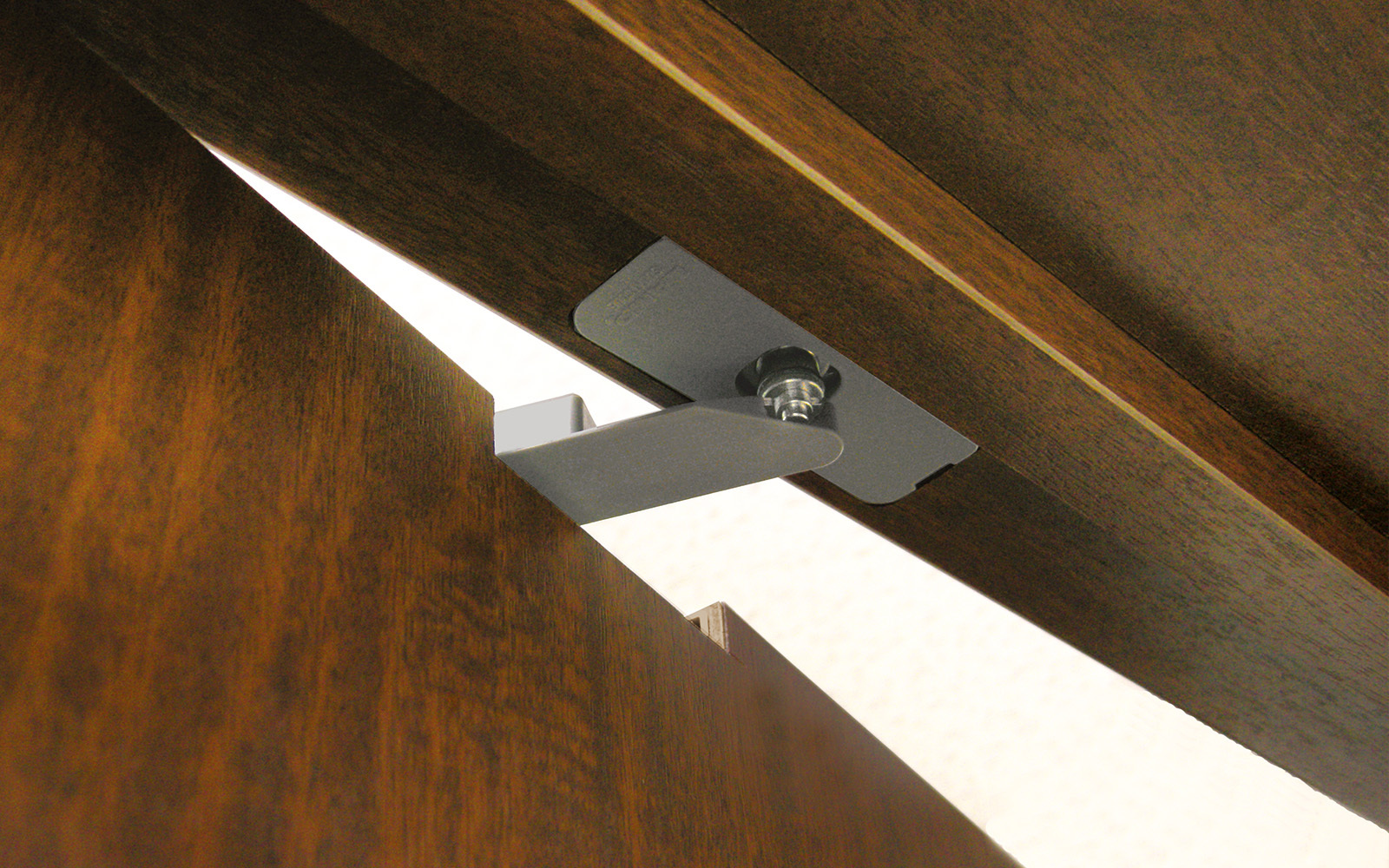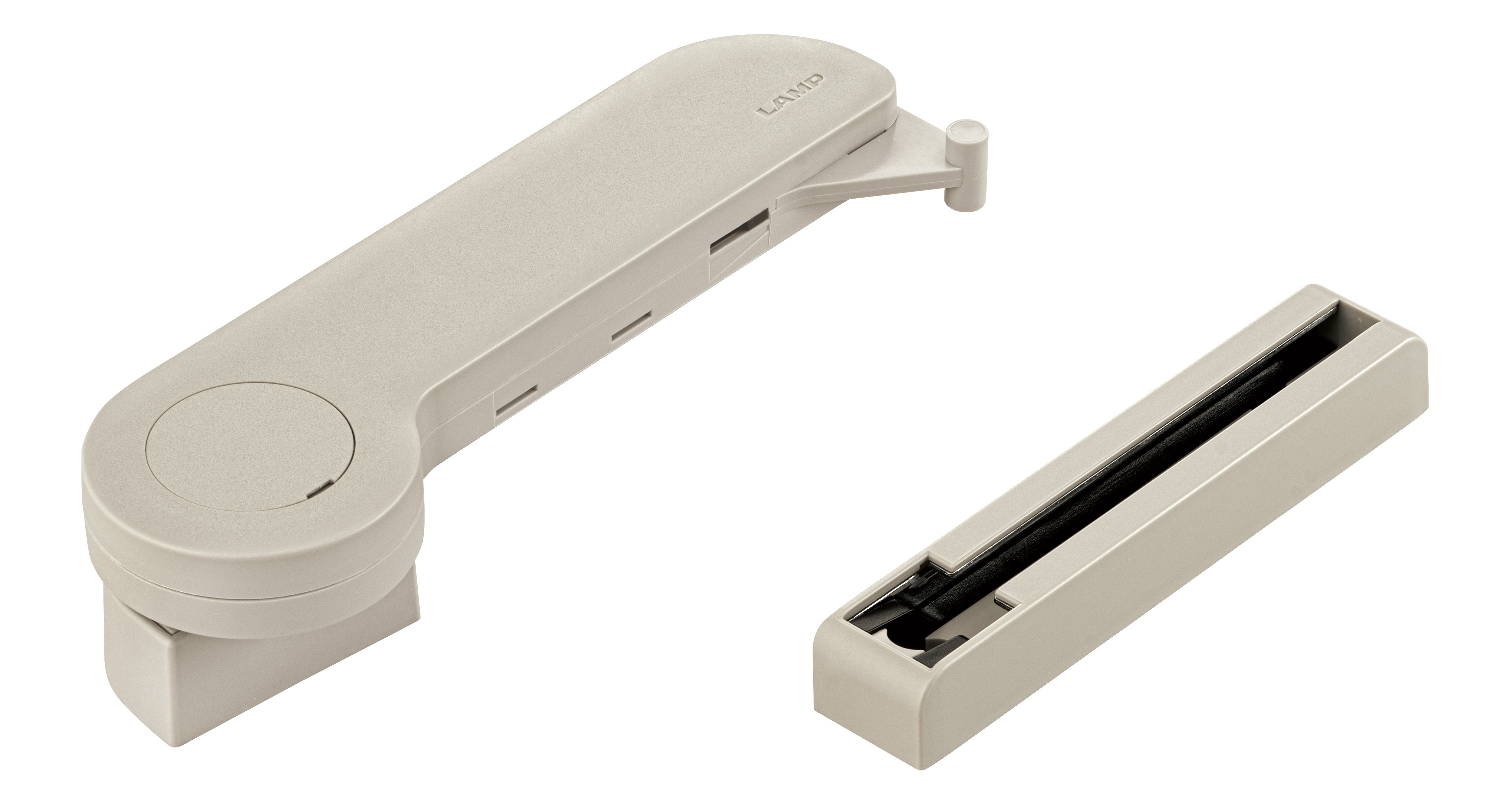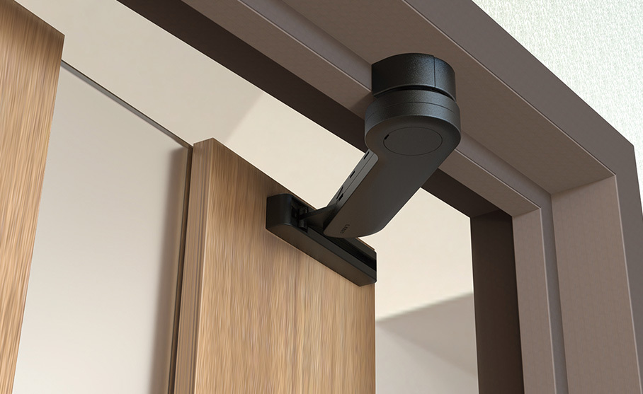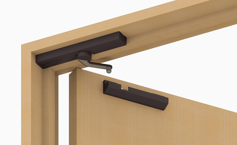 アームに機構部品を集約し、一般的な後付けドアダンパーよりコンパクトに。扉側に取り付く受座も出っ張りが少なく、目立ちにくいデザインです。