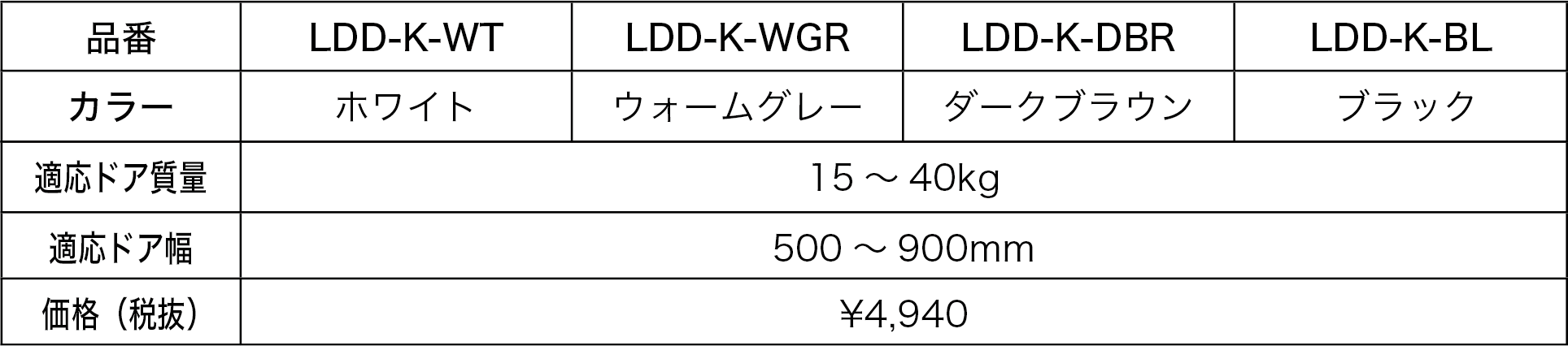 当社では、本製品のほか広い角度でゆっくり閉まり吊元に面付できるLDD-S型、扉を閉じると金具が完全に隠れフラットな空間を作れるLDD-V型、その重量扉用のLDD-V100型など、ニーズに合わせたドアダンパーを展開してきました。