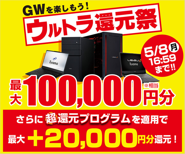 パソコン工房WEB会員またはビジネスご優待会員にご登録の上、期間中に指定金額以上のiiyama PCをお買い上げいただいた方に、最大10万円分相当のWEBポイントを還元いたします。