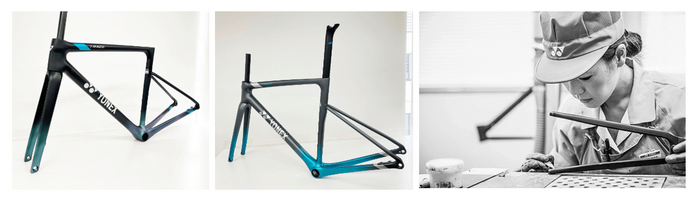 塗装も一般的なロードバイクの約半分となる塗装重量を実現しました。本来、塗装の仕上がりと軽量化は相反する要素ですが1台ずつ自社工場の職人の技で仕上げています。