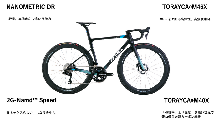 ヨネックスが長年培ってきたカーボン加工技術により、多様な高機能素材を最適な部分に配置。空力性能に重要な箇所には高剛性素材「トレカ®M40X/M46X」や「NANOMETRIC DR」を、しなり性能には「2G-Namd™ Speed」を採用し、空力・剛性・軽量化を高次元で調和させています。