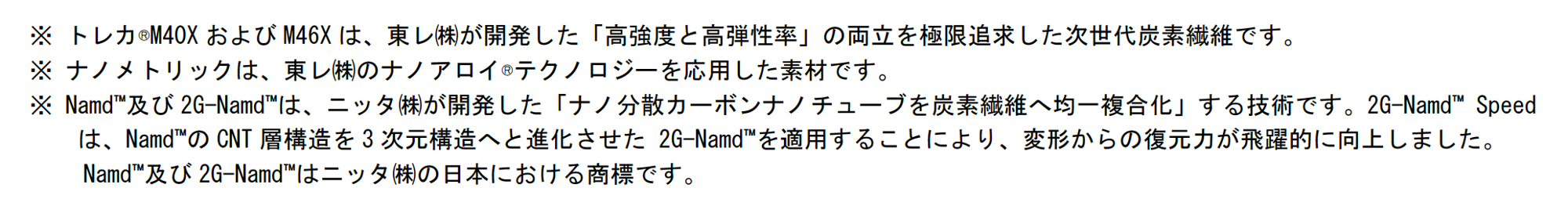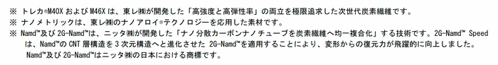 Namd™及び2G-Namd™は、ニッタ㈱が開発した「ナノ分散カーボンナノチューブを炭素繊維へ均一複合化」する技術です。2G-Namd™ Speedは、Namd™のCNT層構造を3次元構造へと進化させた 2G-Namd™を適用することにより、変形からの復元力が飛躍的に向上しました。