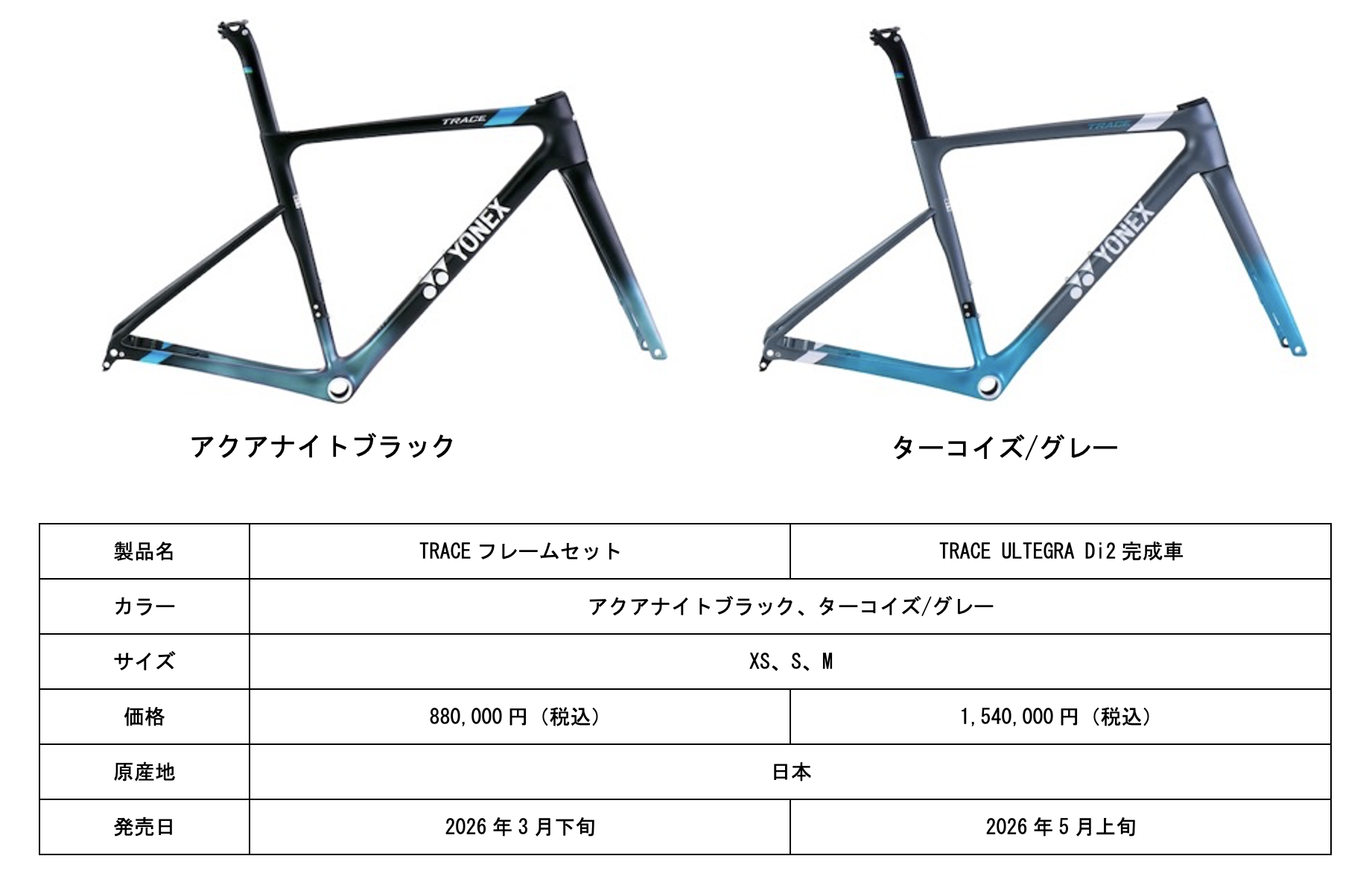 ヨネックス株式会社(代表取締役社長:アリサ ヨネヤマ)は、2014年の発売以来ご愛顧いただいているロードバイクより、エアロロードバイク「TRACE(トレース)」を2026年3月下旬に発売いたします。