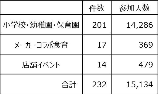 “おいしい”“ワクワク”“ハッピー”をお届けするライフコーポレーションは、これからの未来を担っていく子どもたちに向けて、食育・環境に関する授業や店舗でのイベントを積極的に実施してまいりました。2023年度は合計232回の出前授業やイベントを実施し、15,134名に参加いただきました。