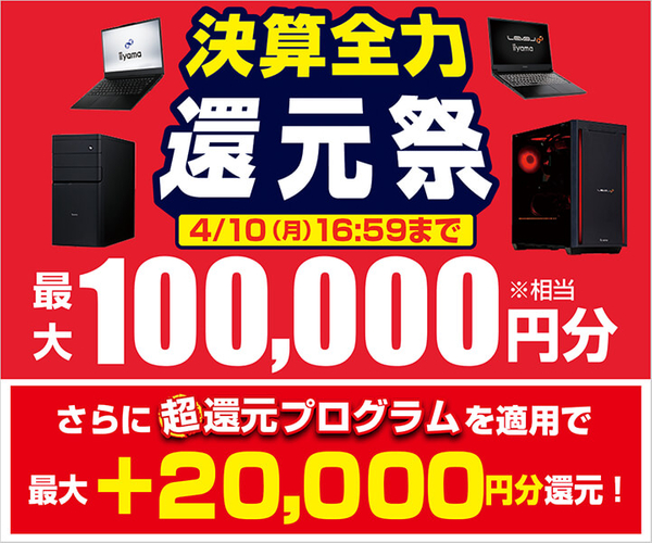 ※セール対象BTOパソコンは4/11(火)13:59まで、セール対象パーツ・周辺機器&セール対象中古商品は4/25(火)13:59までとなります。