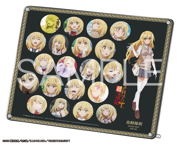 また、缶バッジの新しい楽しみ方として部屋に飾れる缶バッジセットも登場。御坂美琴と『とある科学の超電磁砲T』で注目を集めた「食蜂操祈」の作中のシーンから厳選した20種類の缶バッジを高級感のある特製のアクリルボードに収納。缶バッジは取り外し可能なので、普段使いとしてもお楽しみいただけます。