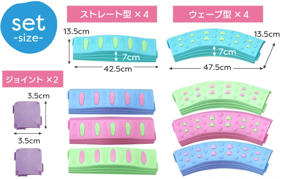 そこからヒントをもらった「でこぼこバランスブロック」は、平均台と足つぼを合わせることでより手軽に子供たちの感覚と運動能力を鍛えることができます。「でこぼこバランスブロック」に含まれるウェーブ型のパーツは33個の小さなハート形の凹凸があり、直線型のパーツは11個のとうもろこし形の凹凸(約3~5mmの凹凸)を含んでいます。