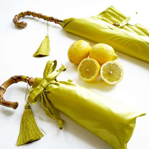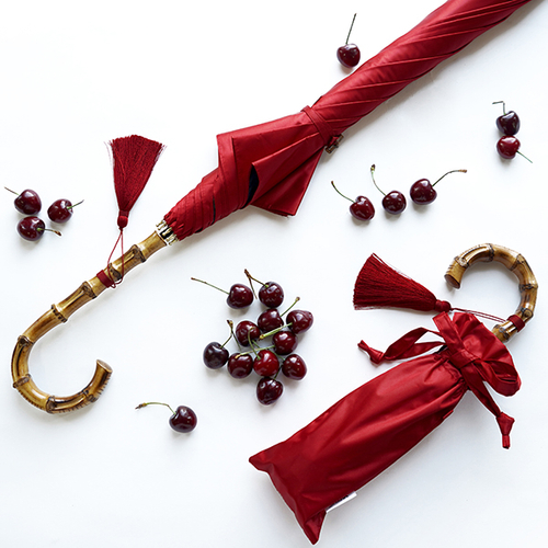果実をモチーフにしたサテンフルーツパラソルは、高級感のあるサテン生地を使って果実のみずみずしさや艶やかさを表現。生地の裏面には黒のコーティングを施しており、紫外線遮蔽率99%、遮光率99.99%、遮熱効果ありのハイスペックな生地を使用しています。晴れの日も雨の日も活躍する晴雨兼用傘です。
