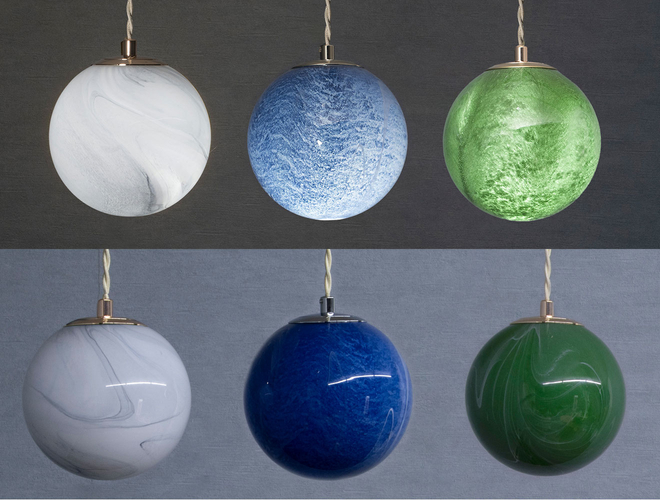 点灯消灯で別人のように変わる表情。消灯時は天然石、点灯時は惑星という二面性を持っている不思議なペンダントライトです。