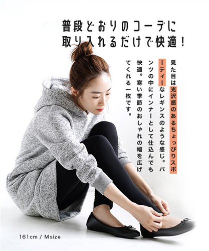 パッチノン裏起毛レギンスは、特殊な炭素糸を使用しており、静電気によるパチパチ感やスカートなどのボトムスが脚にまとわりつく煩わしさを軽減します。