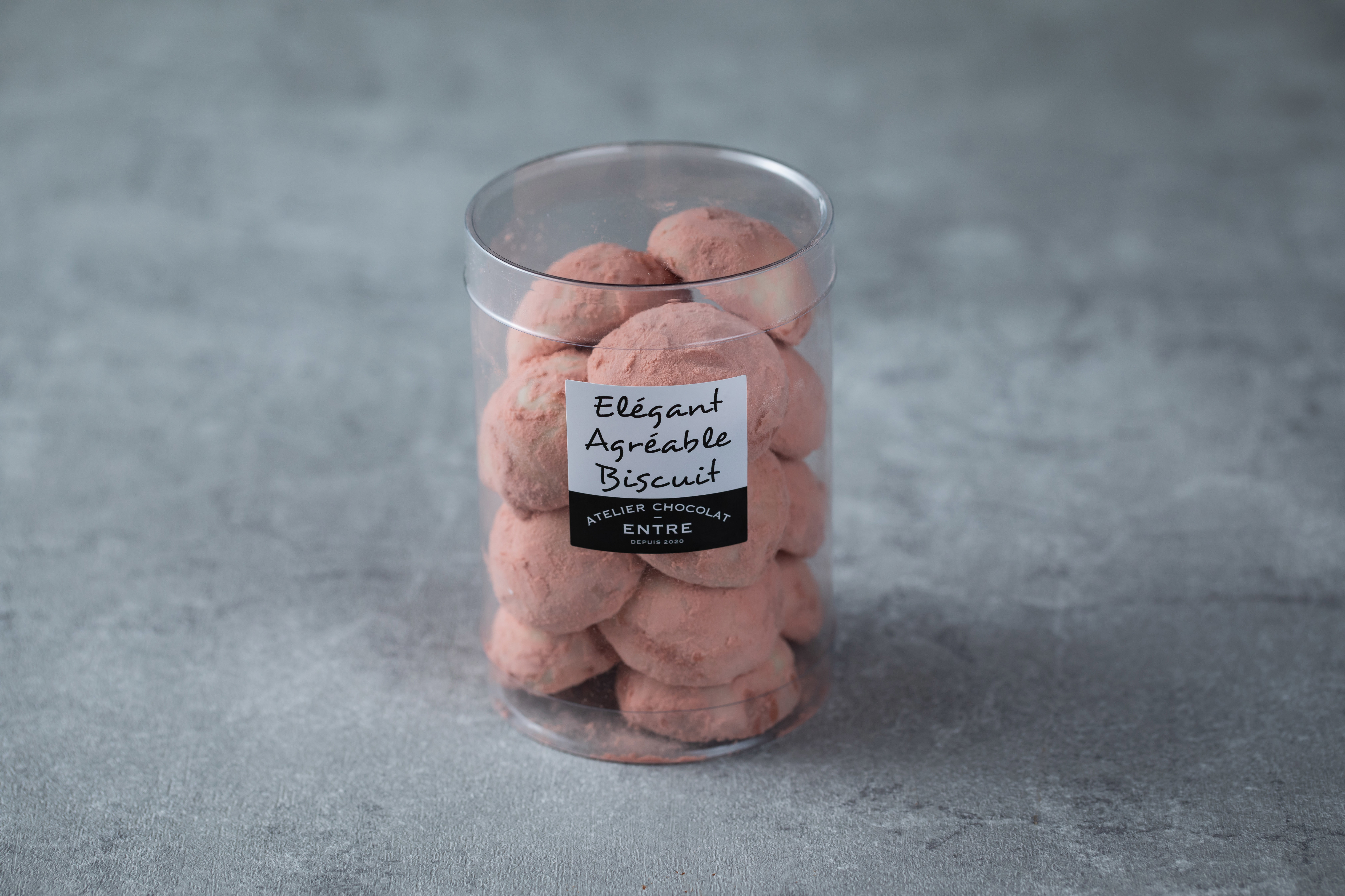 アーモンドを練りこんだザクザクした食感のサブレをホワイトチョコでコーティングし、イチゴのパウダーをまぶした、甘酸っぱくコクのあるサブレとなっております。