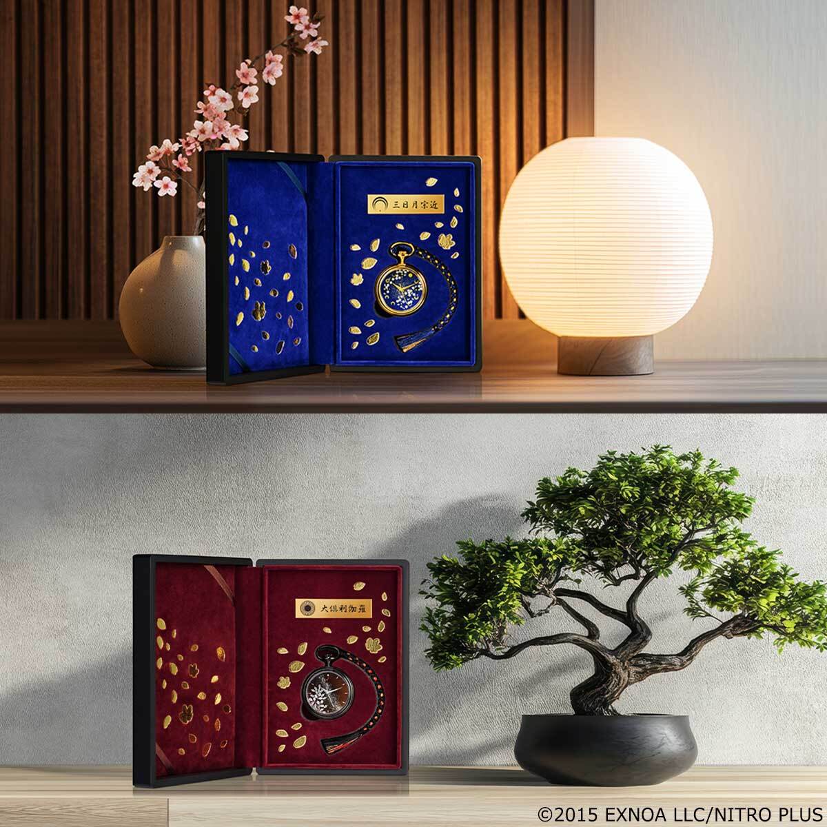 懐中時計は、その美しさにふさわしい、刀剣男士紋の箔押しを施した特製展示ケース入り。