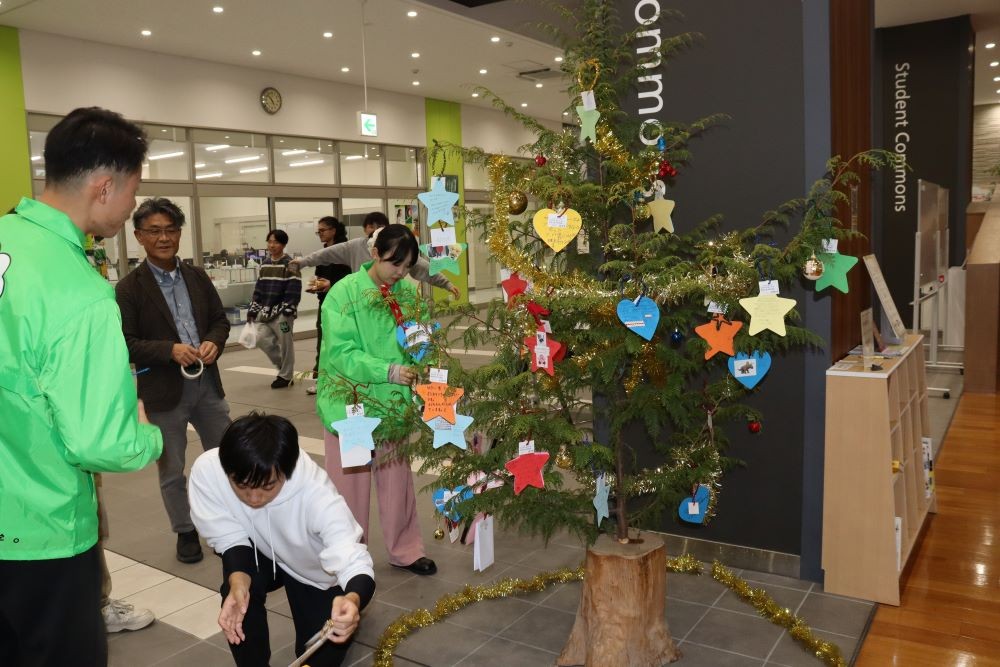 この日はA1号館1階のスチューデントコモンズで、5人の学生が指導教員の内田誠教授とともに高さ約2㍍のモミの木を台に取り付け、岡山、鳥取、島根3県の児童養護施設で暮らす子どもたちが希望するプレゼントを書いた短冊20枚を飾り付けました。「ダウンジャンパーがほしい」「プラネタリウムを見てみたい」「恐竜の模型で遊びたい」……。それぞれの短冊には、子どもたちの素直な願いとともに、日ごろ彼らが頑張っていることや、サンタさんへのメッセージが綴られています。また、寄付者の利便性を考え、購入金額の目安も記されています。