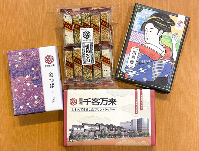オープン記念として、小倉餡を包んだ「豊洲千客万来 金つば」1,100円(税込)、あおさ餅や白ごま餅など4種の餅が味わえる「豊洲千客万来 四彩餅」800円(税込)、黒胡麻や黒蜜風味の歯応えの良い「豊洲千客万来 雷おこし」600円(税込)、配り土産に最適な「豊洲千客万来に行ってきました プリントクッキー」900円(税込)をご用意しました。話題の新施設のお土産として、年代を問わず手に取りやすいお菓子を揃えています。