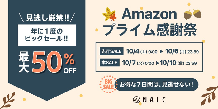 シリーズ累計販売個数380,000個突破※1のジェンダーレスコスメブランド「NALC(ナルク)」(株式会社G.Oホールディングス :大阪府大阪市)は、10月4日 ~ 10月10日の期間中、【Amazon プライム感謝祭】にて人気製品を《最大50%OFF》で販売いたします。