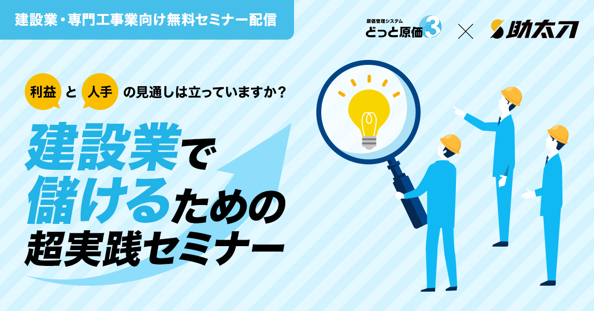 建設業導入実績No.1※1の原価管理システム「どっと原価シリーズ」を開発・販売する株式会社建設ドットウェブ(本社:石川県金沢市、代表取締役:三國 浩明)は、株式会社助太刀(所在地:東京都新宿区、代表取締役社長 兼 CEO:我妻 陽一)と『儲ける実践テクニック』をテーマに、建設工事会社向けのWEBセミナーを2024年5月22日(水)に開催いたします。