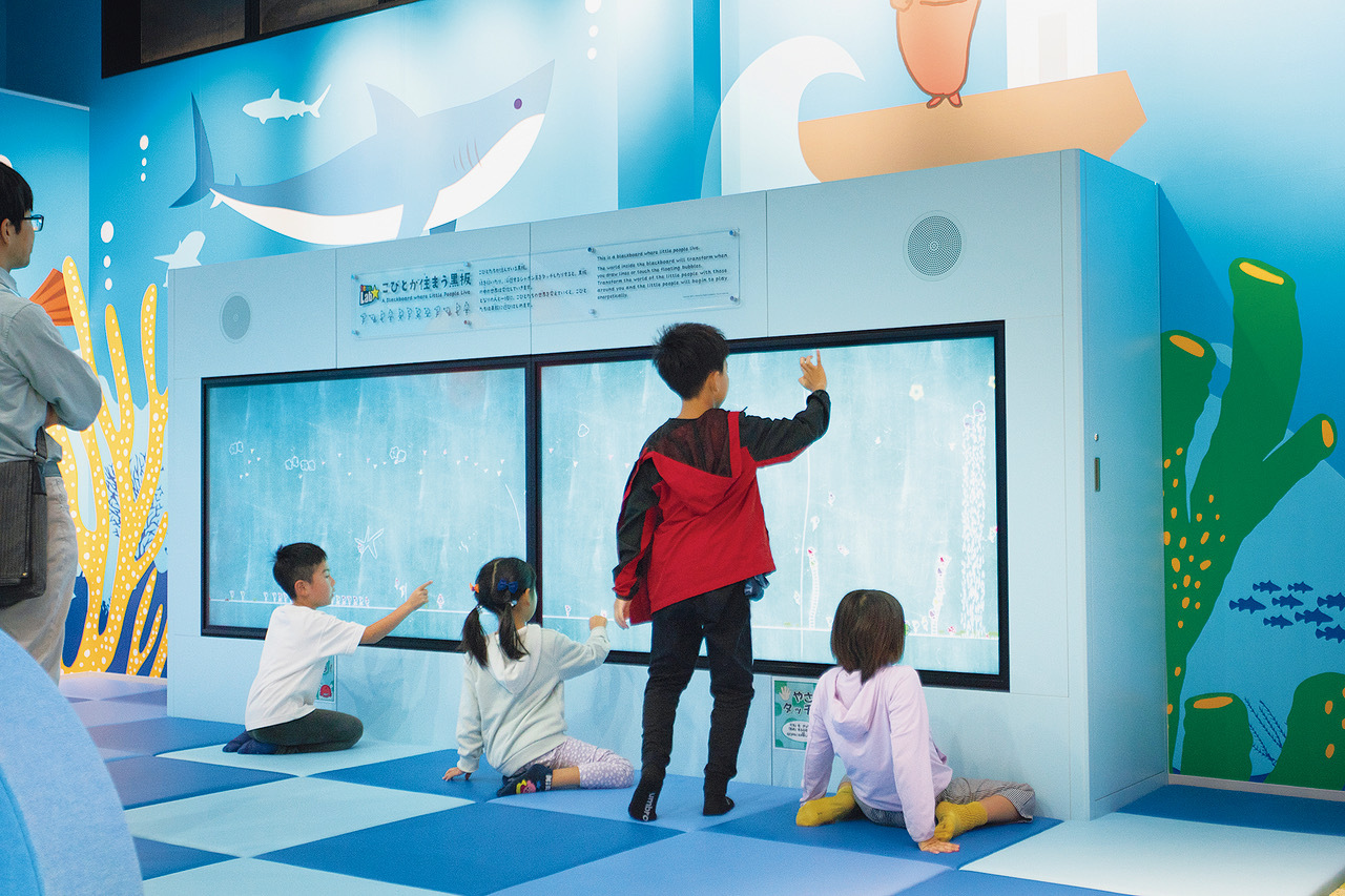 チームラボの「こびとが住まう黒板」を常設展示。線を書いたりタッチすると黒板の中の世界が変化していくモニター作品。黒板の中には、こびとやめんたいパークキャラクターのタラコン博士とタラピヨが住んでます。