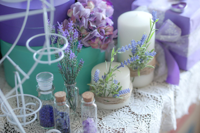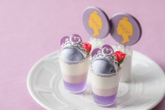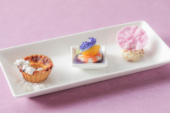 ・スタンド: (上段)薔薇とライチのヴェリーヌ/プリンセスロリポップショコラ(中段)ラベンダーとカシスのオペラ/はちみつのパンナコッタ バタフライピージュレ(下段)すみれの琥珀糖/レモンとベリオットのムース/ぶどうのマフィン