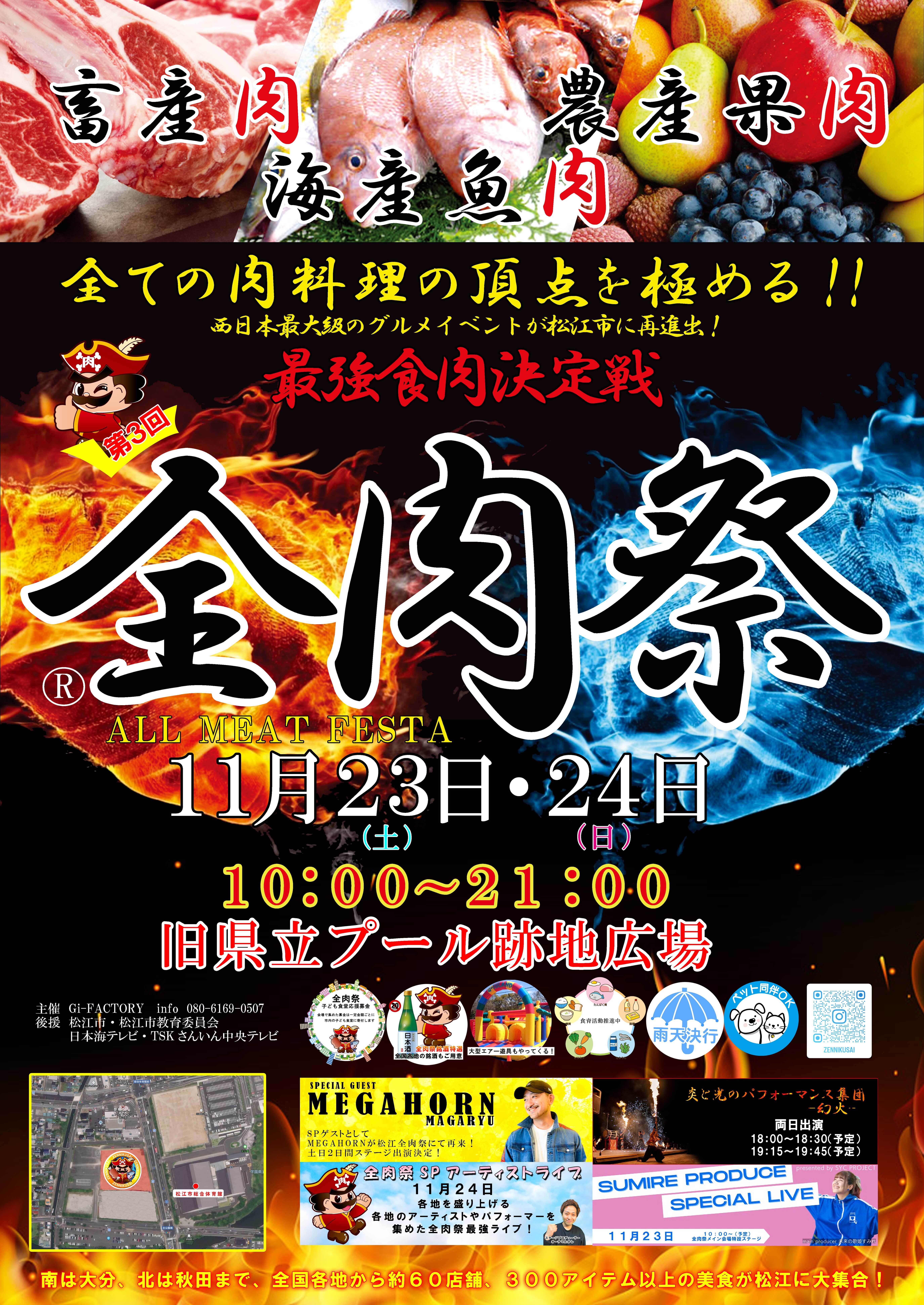Gi-FACTORYは、和歌山・徳島・大阪・広島・山口・岡山・高知・岐阜で開催している大型野外グルメイベント『全肉祭』の第3回を2024年11月23日(土)・11月24日(日)の2日間、島根県松江市にある旧県立プール跡地広場にて開催いたします。