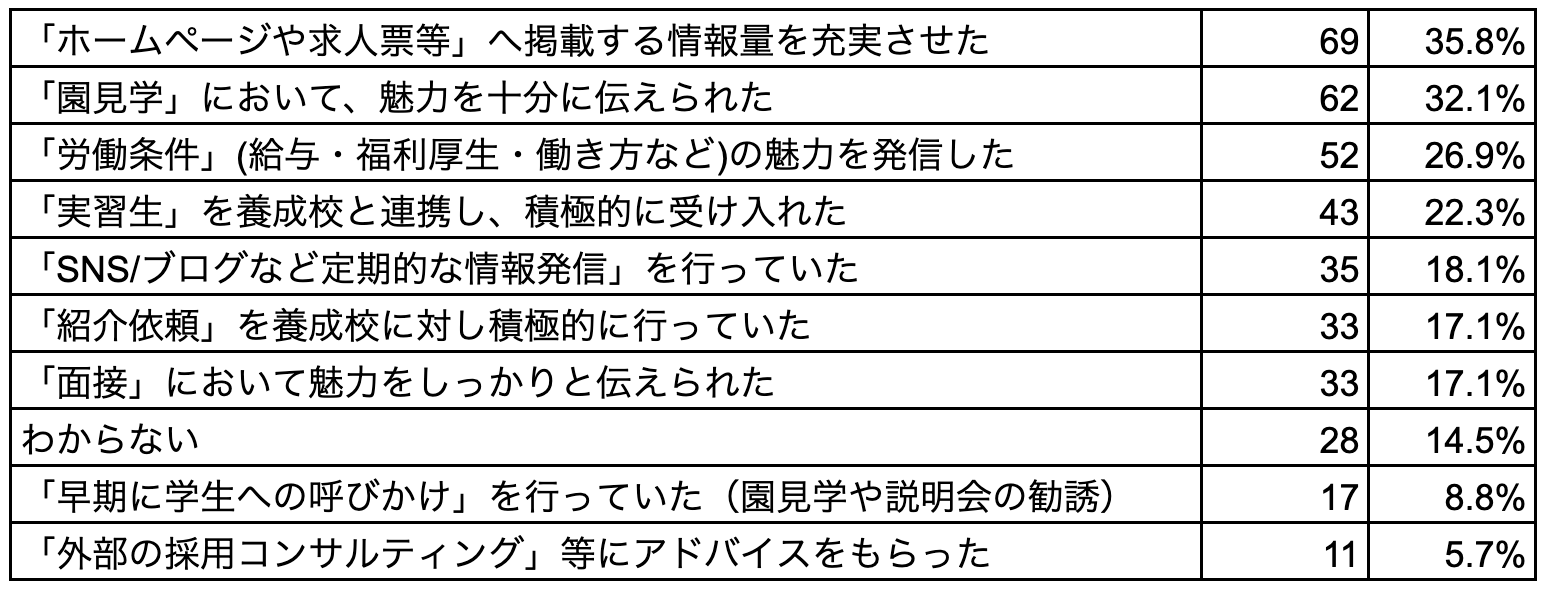 一方で、採用が思うように進んでいない施設が要因としては、「新卒の応募がまったくなかった」(29.0%)に「『労働条件』(給与・福利厚生・働き方など)の魅力不足」(24.8%)、「『ホームページや求人票等』で提供する情報量が少なかった」(21.0%)が続く結果に。待遇面に加え、情報発信に課題を感じている施設が少なくない状況がうかがえます。