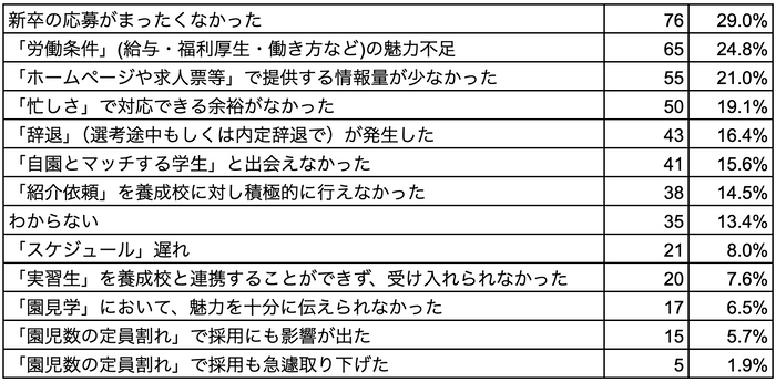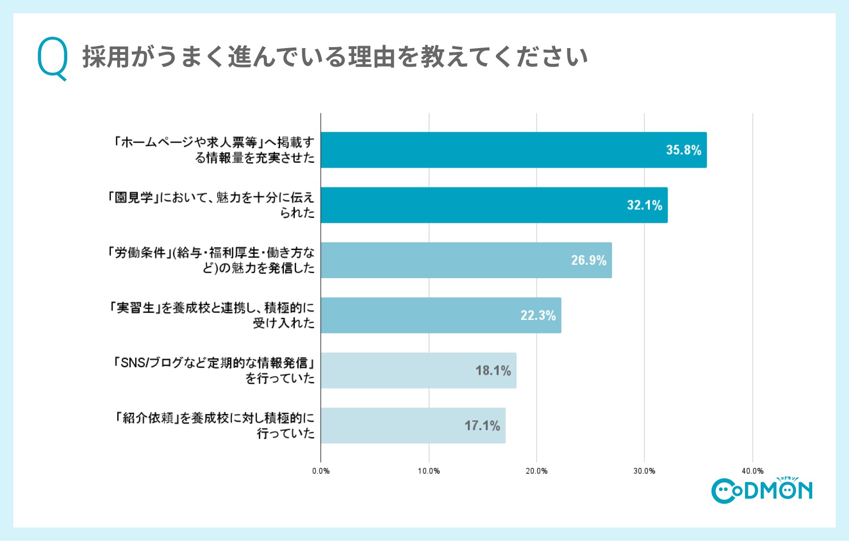 採用がうまく進んでいる理由の上位3位は、「『ホームページや求人票等』へ掲載する情報量を充実させた」が35.8%、「『園見学』において、魅力を十分に伝えられた」が32.1%、「『労働条件』(給与・福利厚生・働き方など)の魅力を発信した」が26.9%。情報発信に力を入れた施設が、スムーズに採用を進めている傾向があることがわかりました。
