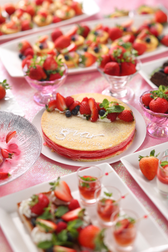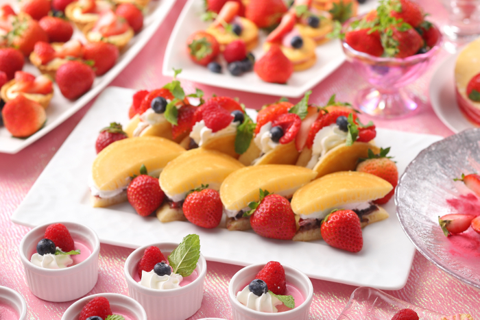また、セイボリーは地中海料理をコンセプトにした「アクアパッツァ」や「アヒージョ」、「ブイヤベース」などの温製料理の他、「いちごのジェノヴァ風サラダ」、「いちごのスパニッシュオムレツ」、「ルッコラと生ハムのイタリアンいちごサラダ」など冷製料理までふんだんにいちごを使用しています。