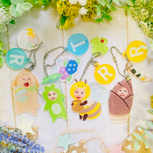 「きぐるみキーホルダー」とは、お子様の「顔写真」と「きぐるみ」を組み合わせたオリジナルのアクリルキーホルダー。
