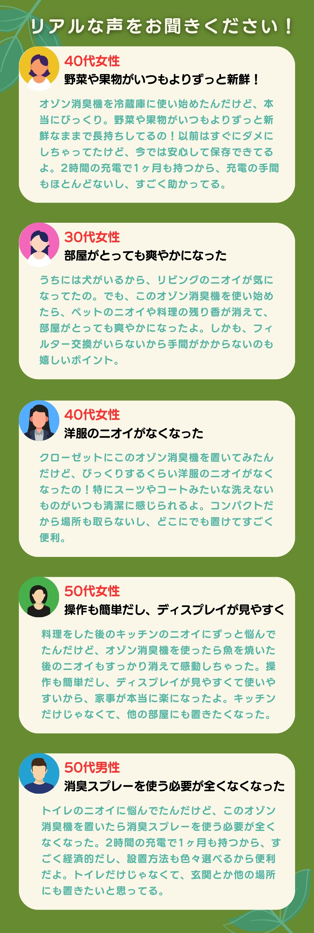 日常の中で、ふと感じる不快なにおい。ペットのにおいや料理の後、車内のこもった空気――そんな悩みはもう過去のものです。私たちが提案するのは、「フィルター交換不要で、瞬時にさわやか空間を実現するオゾン脱臭機」。どんな場所でもこの小さなデバイスが大活躍します。車内、ペットの部屋、キッチン、クローゼット…。気になる場所に設置するだけで、いつでも清潔な空気を実感できます。しかも、手間もほとんどかからず、電源を入れるだけでOK!