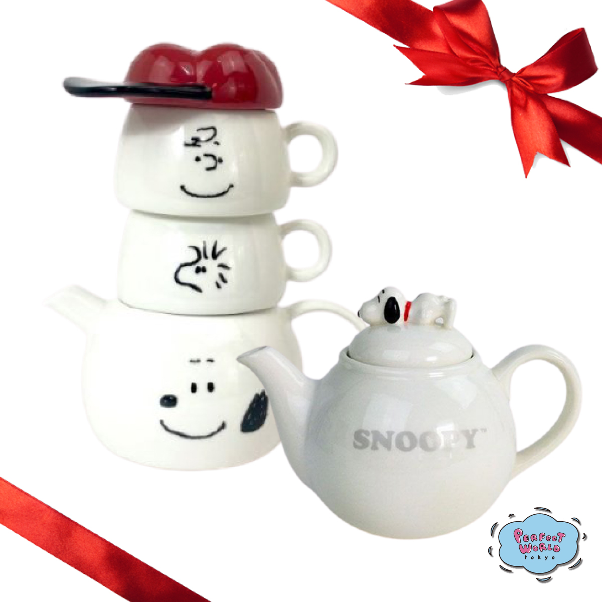 スヌーピーのお顔が書いてあるモノがティーポットなんですね。蓋は帽子のような形をしています。細かいところまでこだわりが見えるアイテムですよね♪