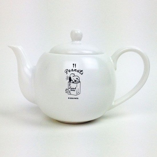 2つ目にご紹介するティーポットは、こちらです。持ち手と注ぎ口の細い曲線が美しさを感じさせます。中央のスヌーピーは、フランスパンと一緒に紙袋に入っているのでしょうか?とっても愛らしいですね。