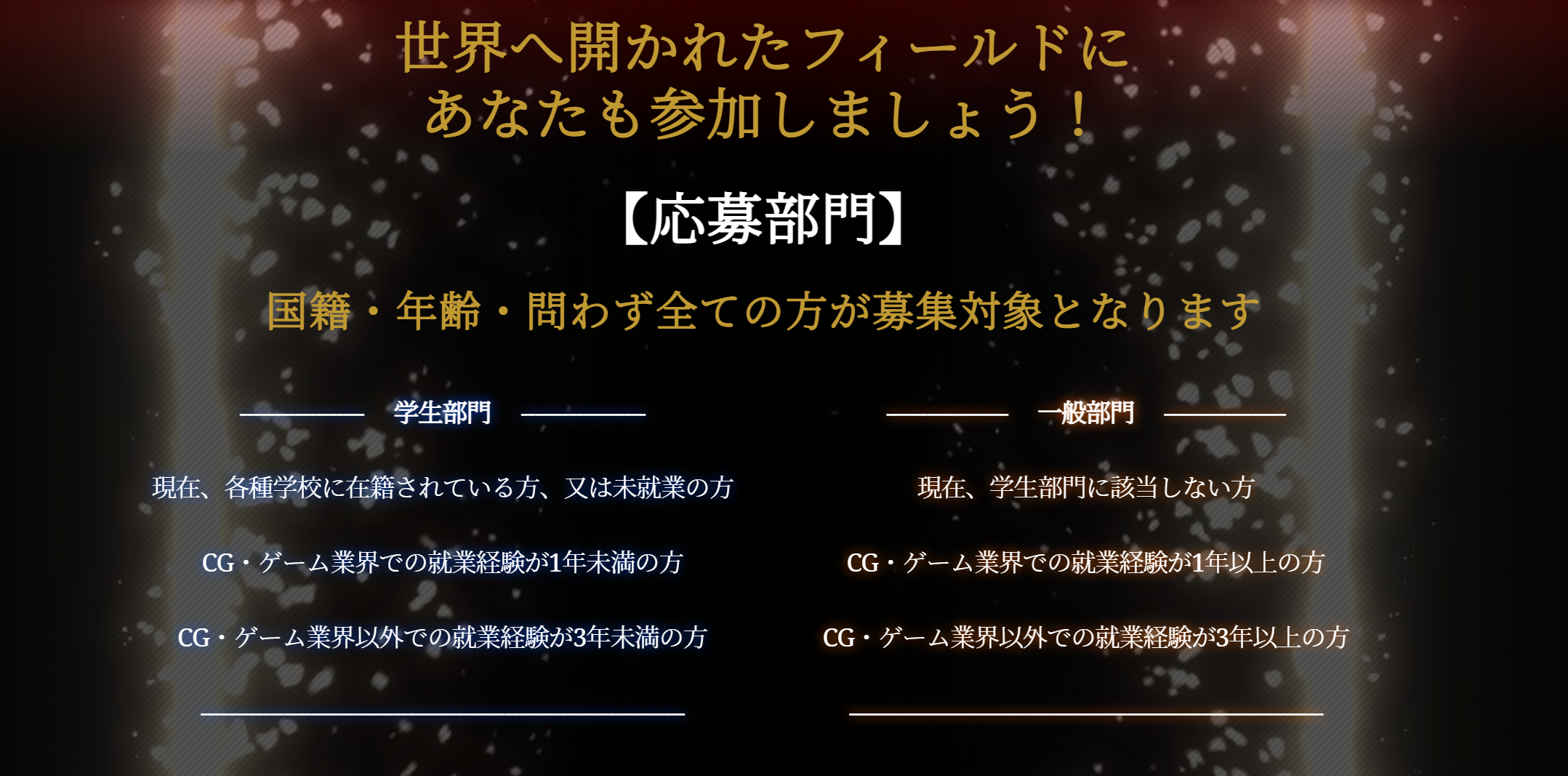 【学生】、及び【一般】のそれぞれの部門で作品を募集し、世界中のアーティストたちがVFXの表現を競い合う、ワールドワイドなコンテストとなります。
