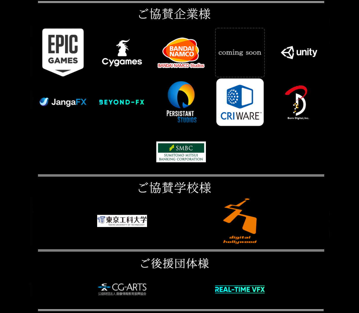 本コンテストは、世界から注目を受ける、格式あるVFXコンテストしての立ち位置を目標として、毎年継続的に実施する予定であり、現在ゲーム・3DCGデザイン業界で大きな影響力を持つ企業・学校・団体様に協賛のご協力を頂いております。