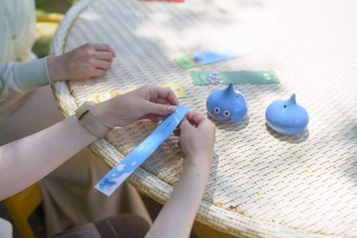 見た目もかわいい“スライム型風鈴”に、お好きな短冊を選んで取りつけ、自由にメッセージを書いて完成!