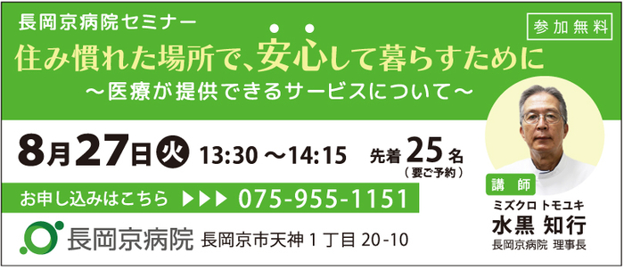 長岡京病院 8月27日(火)に、介護に関するセミナーを開催! 住み慣れた場所で、安心して暮らすために ~医療機関が提供できるサービスについて~
