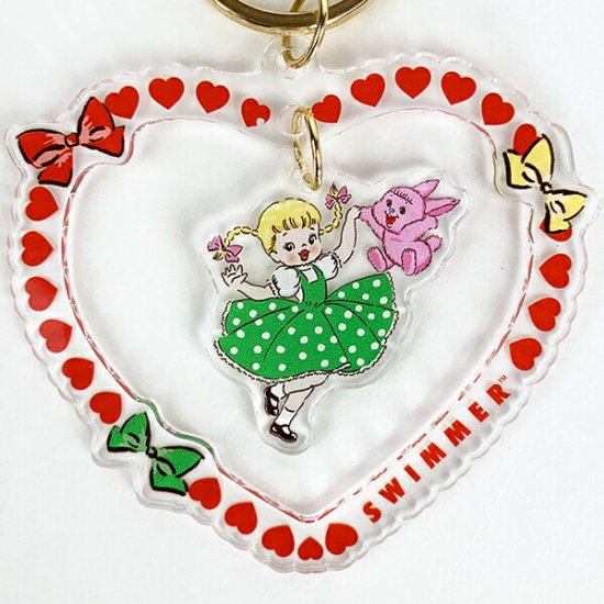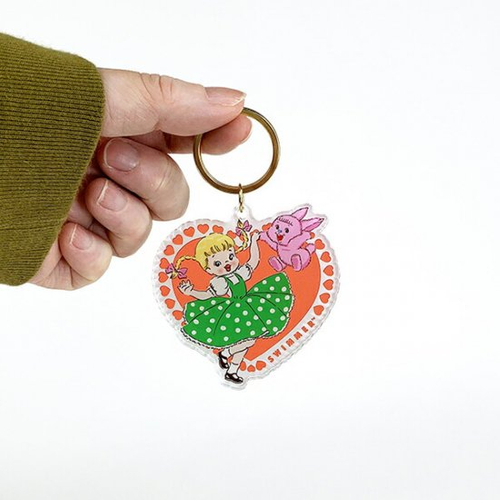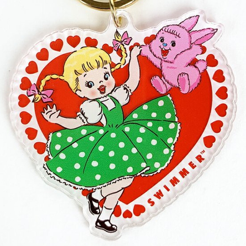 透明感のあるアクリルでできていて、まるでキャンディのようなかわいさです。女の子とうさぎのキャラクターを中心に、ハート型にデザインされています。