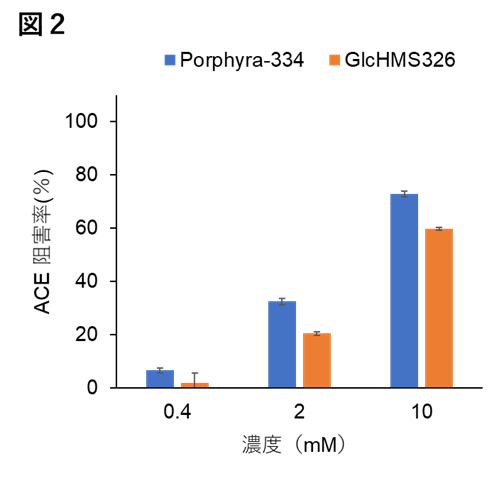 ACE の阻害作用については、Porphyra-334 が GlcHMS326 よりも強い作用を示しました(図2)。Porphyra-334 は、日常的に食べられている海苔に豊富に含まれています。今回の結果は普段の食生活で摂取している海苔に、これまで知られていなかった健康機能性成分が潜んでいることを示すものです。また、抗糖化作用についてもPorphyra-334 が GlcHMS326 よりも強い作用を示しました。