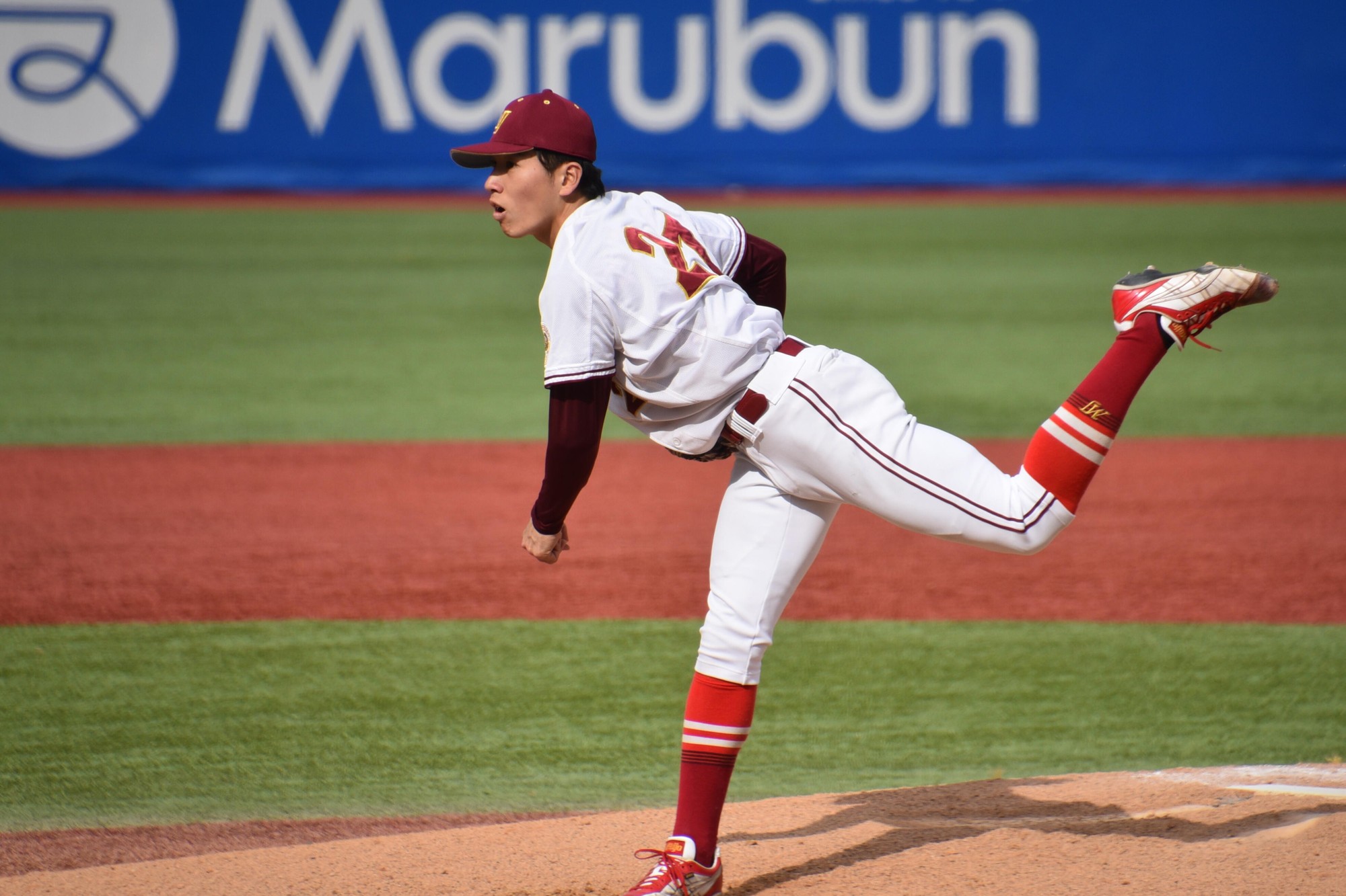 先発の池田翔紀投手(経済学部4年)は4回を投げて失点はその1点だけと粘りの投球を見せると、5回裏から妹尾直哉投手(経済学部3年)、6回裏には大嶽一惺投手(経済学部2年)、8回裏には天野京介投手(人間学部2年)が登板し、いずれも相手打線を無安打に封じて打線の反撃を待ちました。