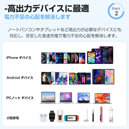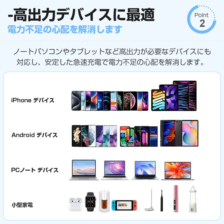 特に、以下のデバイスを日常的に使用するユーザーにとって、「マルチ対応」「コンパクト収納」「急速充電」は重要なポイントとなっています。