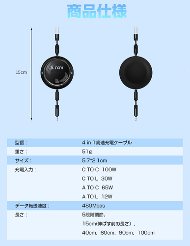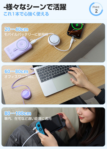 本製品は、最大100Wの急速充電に対応しながら、4種類のコネクタを1本に集約しております。さらに伸縮式設計により、持ち運びや収納の利便性を大幅に向上させた次世代の充電ソリューションとなっています。