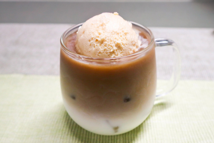1.グラスに氷とアイスコーヒー、牛乳を入れます。