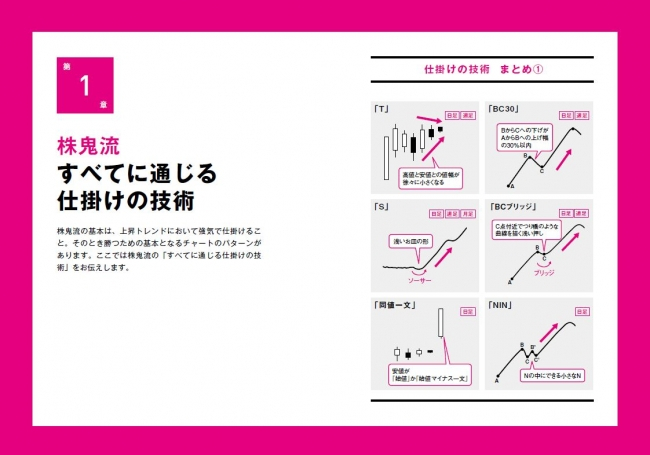 検証を重ねた97点の実際のチャートを掲載し、さらに株鬼流の講義をもとに仕掛けるべきチャートの形とその際の諸条件、仕掛けるポイントと手仕舞うタイミング、その計算方法など、初心者でも簡単に理解し、すぐ実践できるように、わかりやすい言葉で仕掛けの技術を解説しています。
